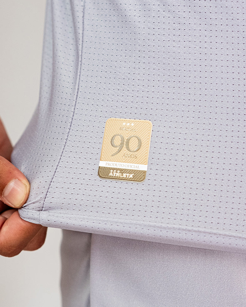 Destaque: Tecido perfurado para conforto térmico e selo comemorativo de 90 anos.